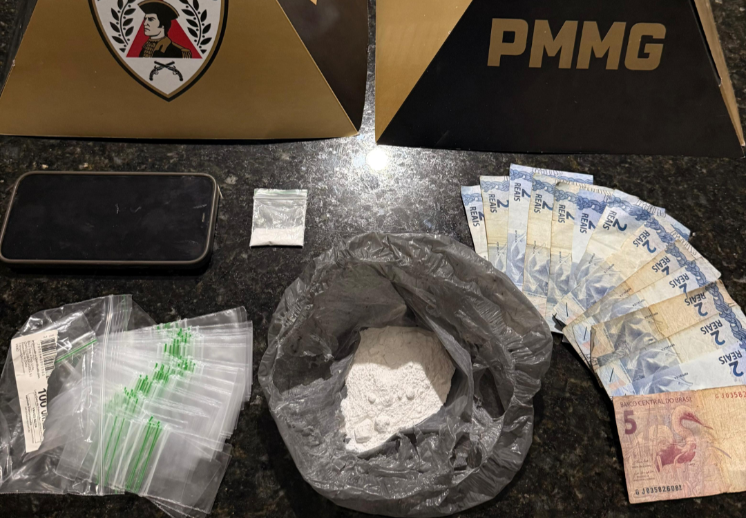 Em continuidade às diligências, a equipe policial se deslocou até a residência do autor. No quarto do suspeito, os militares encontraram uma sacola plástica contendo aproximadamente 20 gramas de substância semelhante à cocaína, além de diversas embalagens do tipo “zip lock”, comumente utilizadas para fracionamento e comercialização de drogas, e dinheiro em espécie.